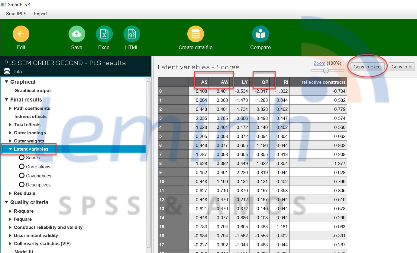 Nếu mô hình ở giai đoạn một đạt yêu cầu, chúng ta sẽ đi tìm các chỉ báo cho biến tiềm ẩn bậc hai bằng cách nhấn vào Open report chọn Latent variables và copy dữ liệu sang file excel. Ở file excel này, chúng ta sẽ có các chỉ báo cho biến bậc hai, trong ví dụ này là AS, AW và QP.