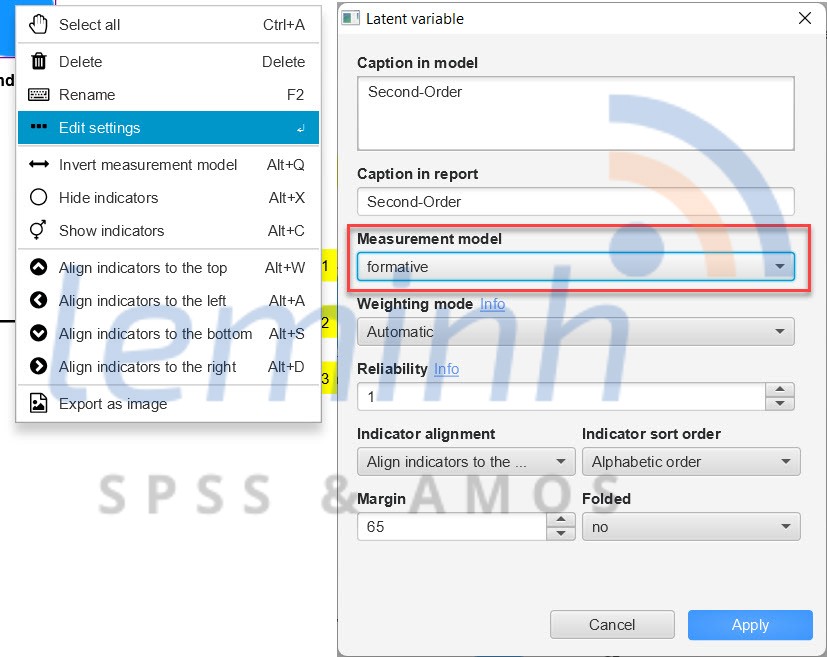 Đối với mô hình cấu tạo, để thay đổi mũi tên chúng ta click chuột phải vào biến bậc hai (Second-Order) và chọn Edit settings, ở mô hình đo lường chọn formative nhé.